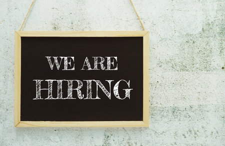 We are Hiring typography text on wooden blackboard hanging on concrete background