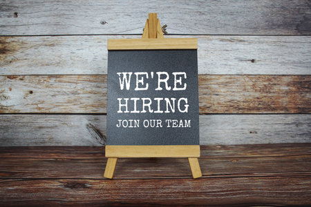 We are hiring and Join our Team text message on blackboard stand on wooden background