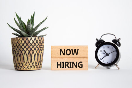 Now Hiring symbol. Wooden blocks with words Now Hiring. Beautiful white background with alarm clock and succulent plant. Business and Now Hiring concept. Copy space.
