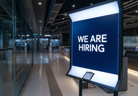 A modern office corridor featuring a large illuminated sign that reads 'We Are Hiring,' symbolizing job opportunities and recruitment in contemporary workplaces.