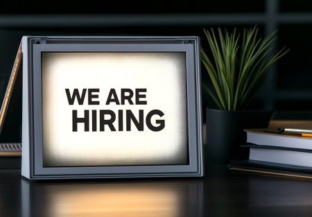 A modern workspace with a glowing sign that reads 'We Are Hiring', highlighting job opportunities and recruitment efforts in a professional environment.