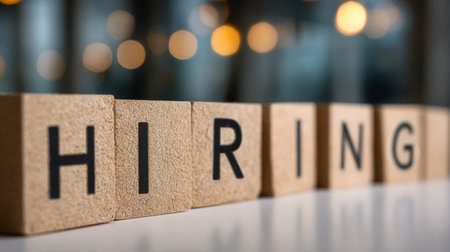 Wooden cubes with the inscription Hiring on a blurred modern background of golden flour
