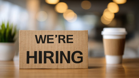 A wooden table with a cup of coffee and the sign We're hiring. We're hiring. Recruiting and HR management concepts.
