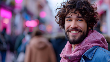 A close-up portrait of a young man with curly hair and a warm smile, set against a calming blue backdrop. His expressive eyes and friendly demeanor radiate positivity and approachability, inviting connection and warmth.