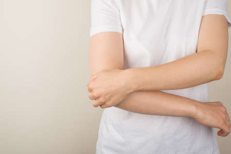 Cropped closeup photo of woman in white t-shirt holding her right elbow on isolated gray background with copyspace