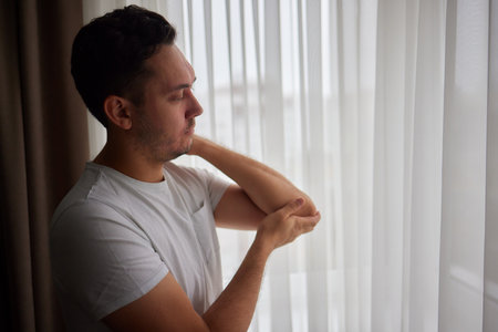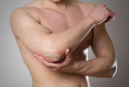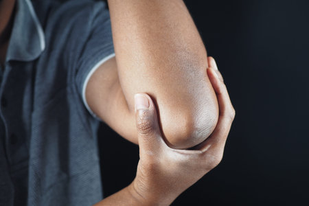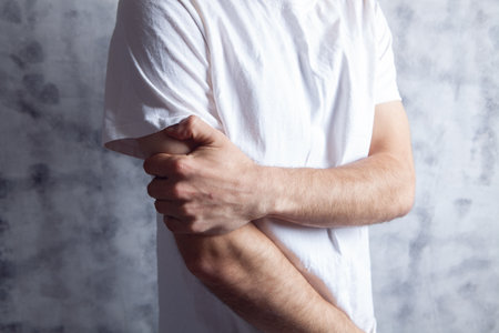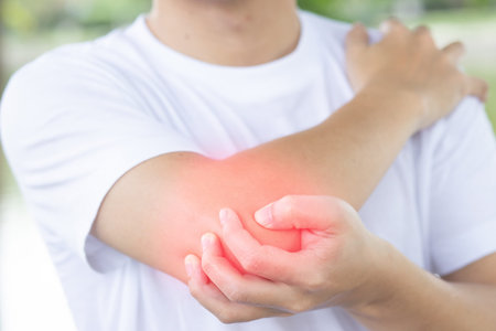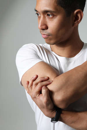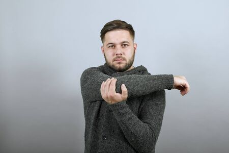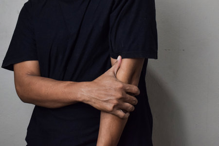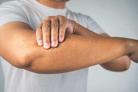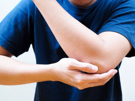 Young man suffering arm and elbow pain, chronic joint pain and bone degeneration