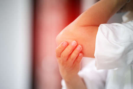 Cropped image woman with joint inflammation. Female's elbow. Arm pain and injury concept.