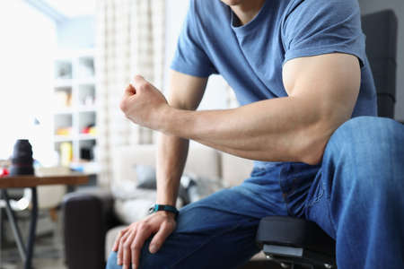Closeup hand man in blue T-shirt with swollen vein. Athlete needs massage and anesthesia, for improving blood circulation in hand. Inflammatory vein diseases. Postoperative recovery person