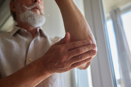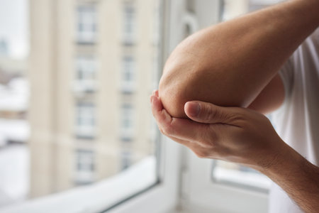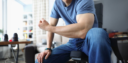 Man hand massage physiotherapy elbow is sore and numb, exhausted, tingling. Guillain-Barre Syndrome, a side effect of the Covid-19 vaccination.