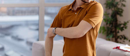 Cropped image of fitness sporty guy sportsman in t-shirt spend weekend in home gym isolated on yellow background. Workout sport motivation concept. Touch arm elbow with elastic bandage, get injured