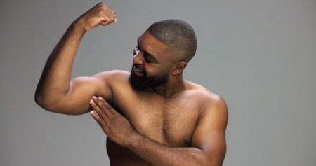 Bicep, body and smile of shirtless black man in studio for fitness, health or strong muscles. Arm, exercise and power with happy African person isolated on gray background for strength or wellness