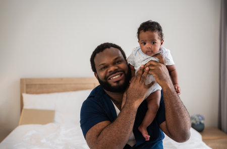 This heartwarming image captures a joyful father holding his infant with warmth and affection, highlighting the beautiful bond between them in a cozy indoor setting.