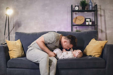 A man plays with his child on the couch in a cozy apartment. Dad and baby are happy.