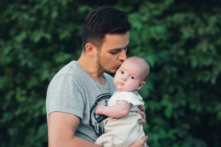 young Caucasian dad with beard hugs newborn baby boy son