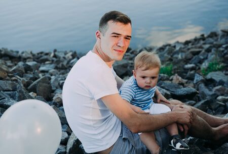 Baby in the arms of dad. Walk near the water. Baby and dad against the sky
