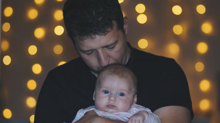 Father gently kissing newborn, soft christmas lights blurring background with warm, tender holiday atmosphere