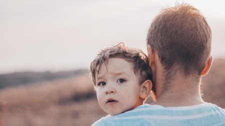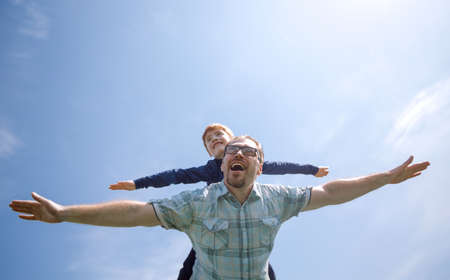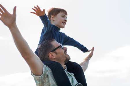 Family holiday and togetherness. Father and son together. Daddy and son smiling and hugging. Carefree. Imagination.