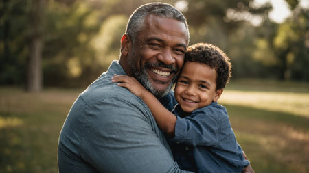 Joyful grandfather embraces grandson in a serene outdoor park during golden hour