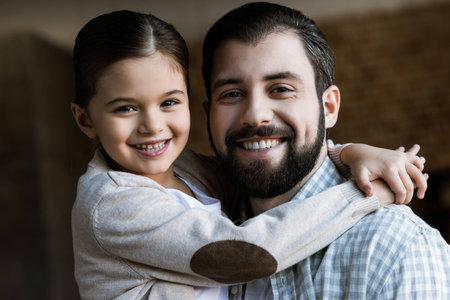 cheerful father and daughter hugging and looking at camera at home