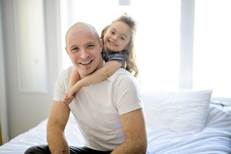 Happy father and daughter having fun together on a bed