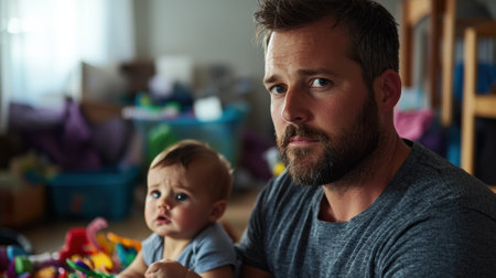 A heartwarming image captures the tender bond between a loving father and his baby son Bathed in soft, natural light, the scene evokes pure joy, unconditional love, and cherished moments The close-up shot highlights the father's protective instincts and the sweet smiles shared between father and child, creating a timeless AI Generative