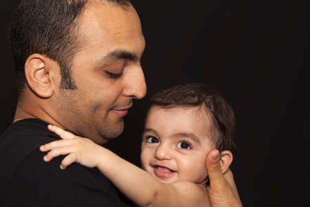 Young father hugging his little son and looking at him lovingly. Studio portrait on black background.