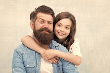 Family hug. Strengthening father daughter relationships. Child and dad best friends. Friendly relations. Fathers day concept. Lovely father and cute kid. Father and daughter hug light background