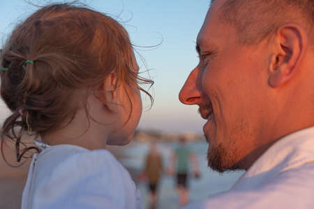 A young dad with a little daughter walks along the sea beach in the sunset rays. A father and a two-year-old daughter in white clothes are walking along the surf line against the backdrop of sea waves. Photo about family values, father's day.