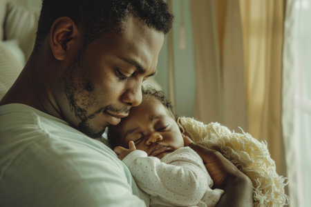 African American parent cradling their newborn baby. Unwavering parental affection, celebration of Father's Day.