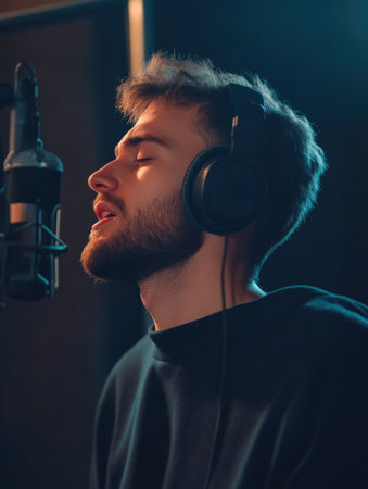 A young man wearing headphones sings into a microphone in a recording studio, expressing passion while performing a song.
