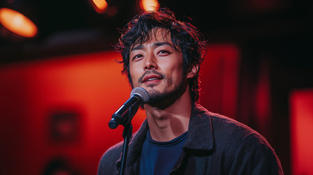 Asian rapper, singer on stage reading rap, dynamic pose, hero angle, AI generative illustration