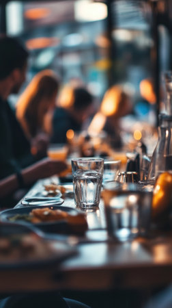 Guests enjoy a delightful meal at a bustling restaurant table illuminated by soft light, creating a warm and inviting ambiance.