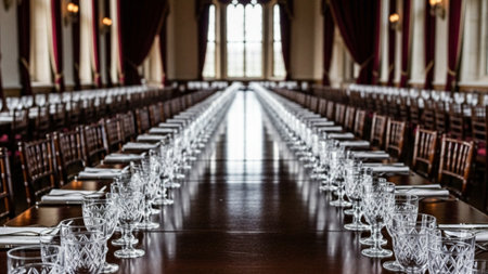 Delicate, etched glass water goblets set up in long, precise rows on a polished banquet table, empha