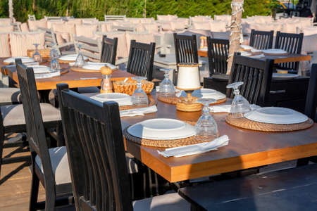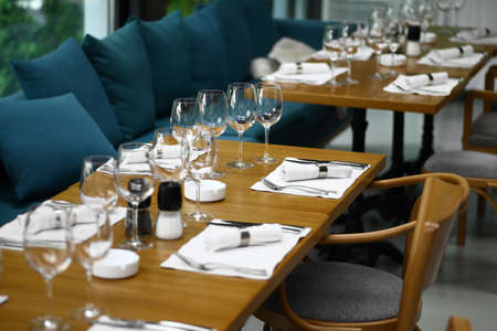 Many wooden tables in cafe with plates and glasses are waiting for guests. horizontal photo.