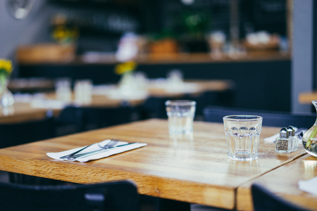 Shallow depth of field (selective focus) image with a restaurant table ready to receive customers. Empty glasses and tableware.
