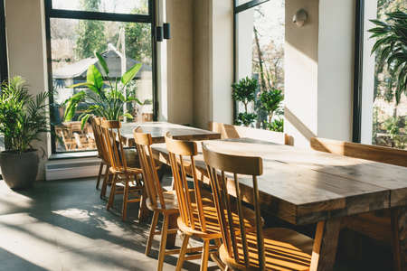 Interior of a restaurant with wooden tables and chairs, loft interior
