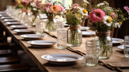 Table set for an event party or wedding reception in rustic style