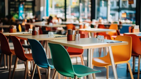 A bright and modern restaurant interior featuring colorful chairs and tables. This vibrant space is perfect for casual dining and social gatherings.