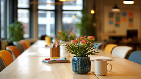 Coworking space with empty wooden table, a potted plant and a cafe area in background