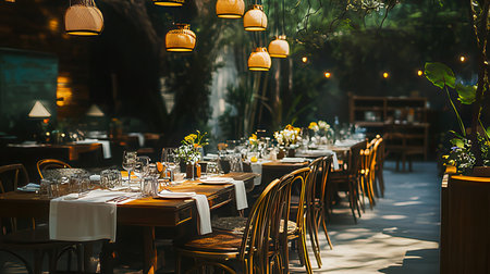 Restaurant interior with wooden tables, chairs, lamps and plants