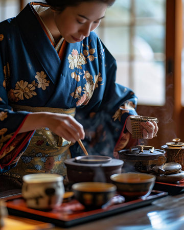 A woman performing a tea ceremony ritual in a tranquil Japanese setting with traditional elements