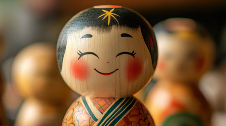 A traditional Kokeshi doll featuring a smiling face and colorful floral patterns stands out among other handcrafted dolls in a vibrant Japanese market.