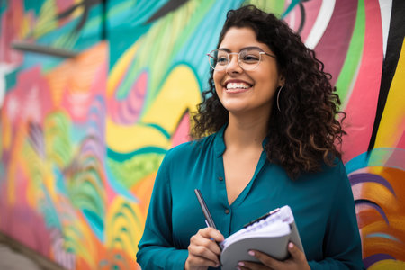 Sales representative with a warm smile and a friendly demeanor, holding a pen and notebook, in front of a colorful abstract mural