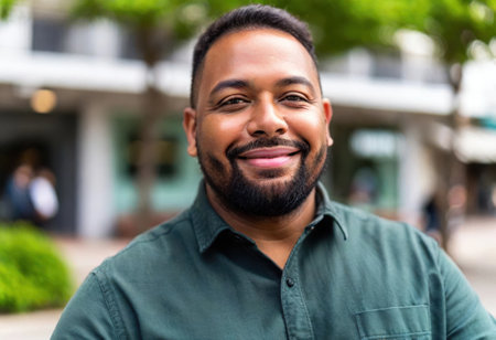 A close-up shot features a smiling man with a beard and short dark hair. The image displays warm tones with soft lighting. The composition highlights the man's expression, suggesting a positive mood. Suitable for various commercial uses, including advertising and editorial content.