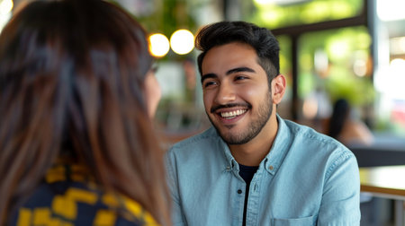 Smiling man talking to his girlfriend while sitting in cafe. Cheerful young man looking at his girlfriend and smiling