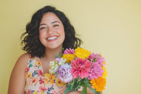 Smiling young Latina woman holding a vibrant bouquet of dahlias and marigolds, celebrating natural beauty and happiness