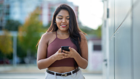 Young 20 year old Latina brunette woman uses her cell phone to send messages, make calls, buy, pay, study and make appointments