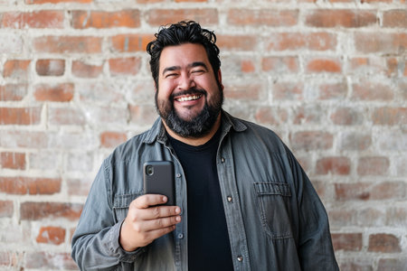 fat man using his phone and smiling
