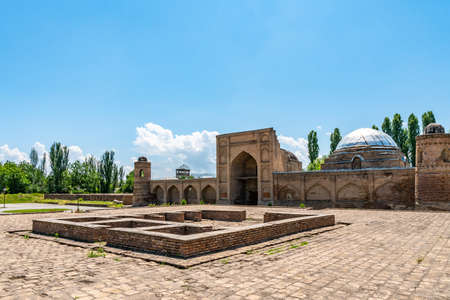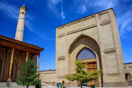 Mosque with carved columns of sandalwood, minaret and entrance of Hazrat Imam Ensemble in the center of Tashkent city, Uzbekistan