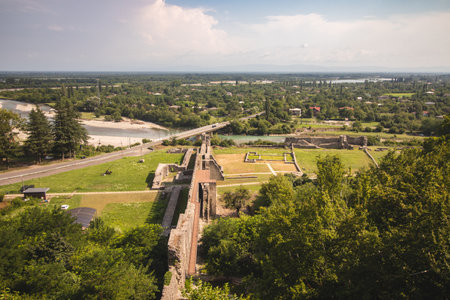 Aerial view of the old bridge over the river from Nokalakevi fort in Georgia.